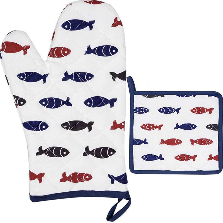 Le gant et la manique motif Océan apportent une touche marine et ludique à votre cuisine. L'imprimé représentant des poissons colorés évoque la mer et les vacances, parfait pour une ambiance fraîche et conviviale lors de la préparation des repas.