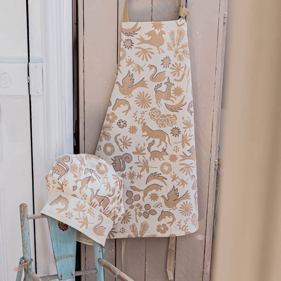Un tablier mixte imprimé de motifs animaux dans les tons beige.