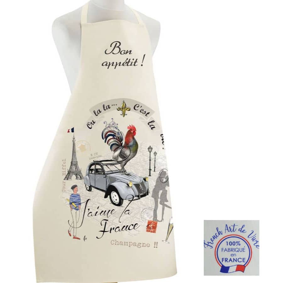 Créé et fabriqué en France En pur coton, pour un confort optimal, le tablier J'aime la France reprend les codes de notre beau pays : Tour Eiffel, marinière, 2 CV, baguette de pain, drapeau... Décoratif, mais aussi très utile en cuisine pour concocter de bons petits plats sans se tacher. Imprimé su ...En savoir plus