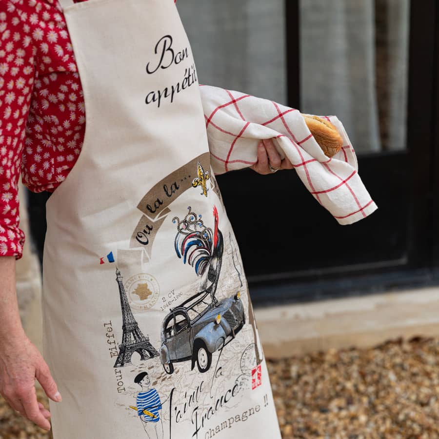 En pur coton, pour un confort optimal, le tablier J'aime la France reprend les codes de notre beau pays : Tour Eiffel, marinière, 2 CV, baguette de pain, drapeau... Décoratif, mais aussi très utile en cuisine pour concocter de bons petits plats sans se tacher.