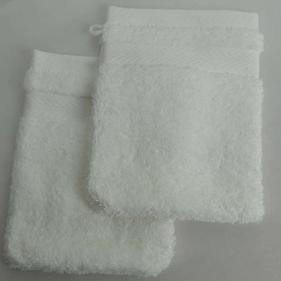 Lot de 2 gants de toilette blancs en éponge bouclette moelleuse et de qualité 100% coton.