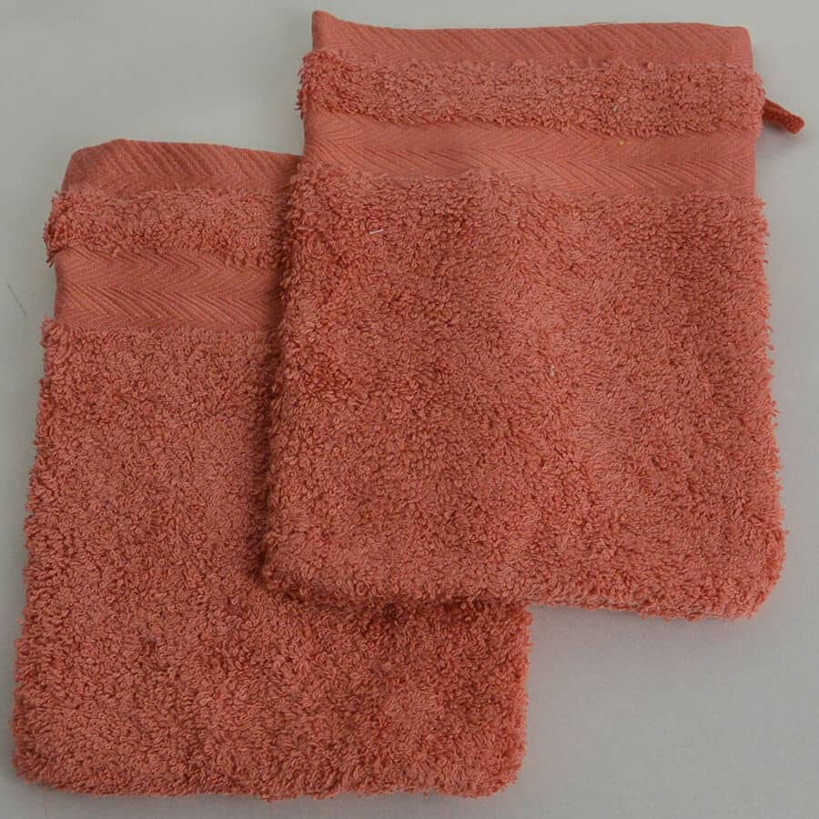 Lot de 2 gants de toilette terracotta en éponge bouclette moelleuse et de qualité 100% coton.