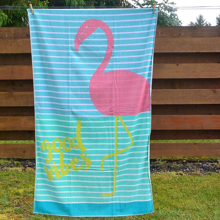 Le drap de plage Flamand Rose est tissé à 100% coton, une fibre naturelle qui garantit confort et bien-être tout au long de votre été.