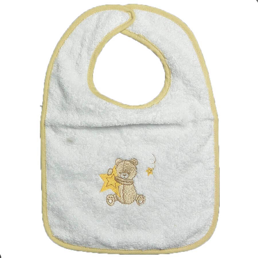 - Un bavoir plastifié, pratique et orné d’une broderie raffinée.