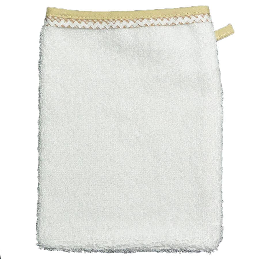 - Le gant de toilette assorti : confectionné dans le même coton éponge doux, il est bordé d’un biais de coton identique aux autres pièces du set.